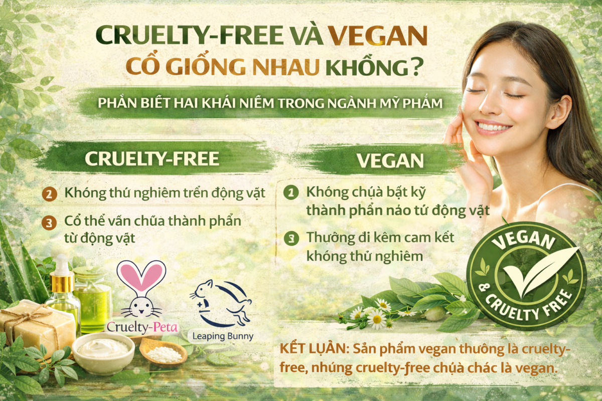 Nhiều người nhầm lẫn giữa hai khái niệm này. Cruelty-Free Không thử nghiệm trên động vật Có thể vẫn chứa thành phần từ động vật Vegan Không chứa bất kỳ thành phần nào từ động vật Thường đi kèm cam kết không thử nghiệm Một số tổ chức như PETA hoặc Leaping Bunny cấp chứng […]